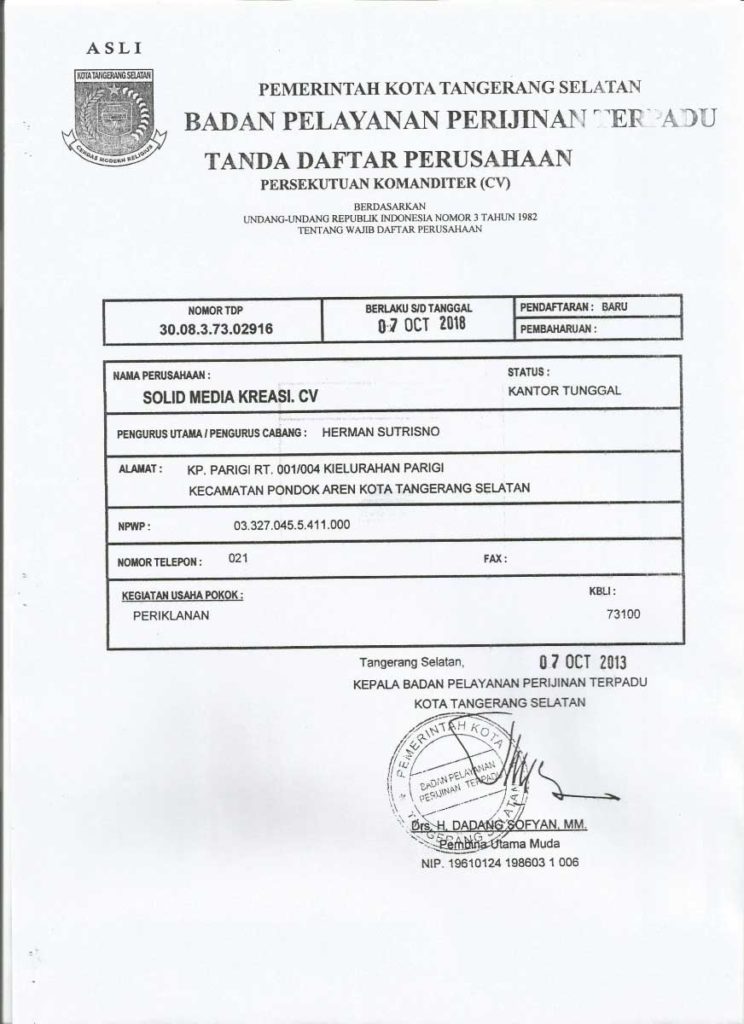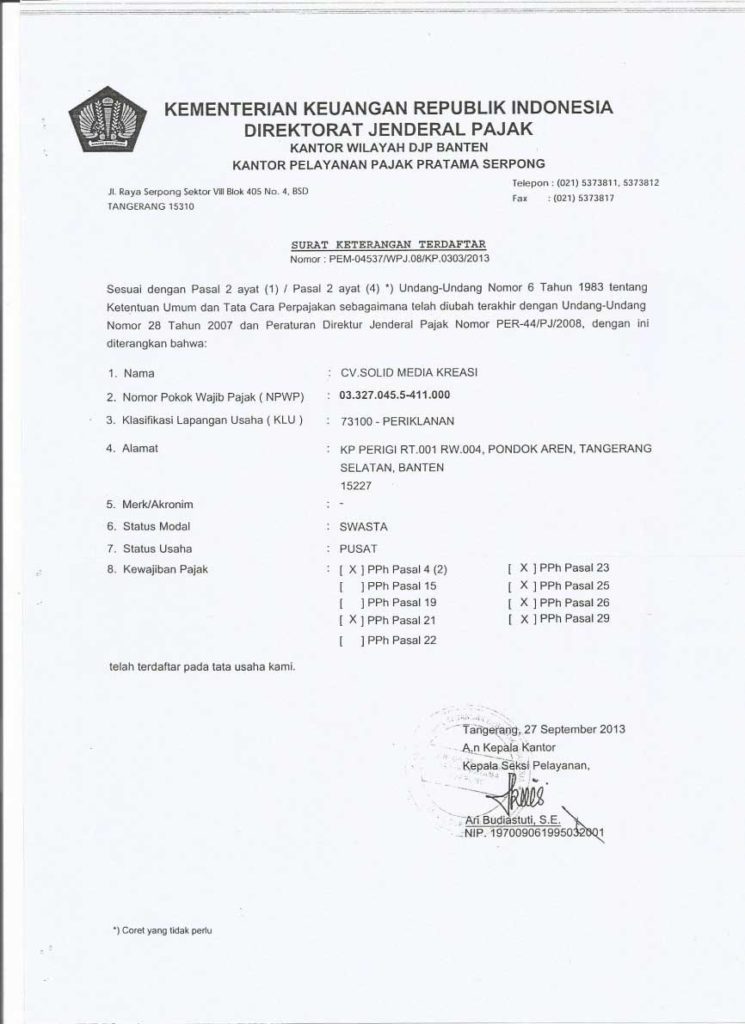 Call Us (021) 27622053 0878 - 085 - 71117 0822 - 779 - 71117 Address​ Jl. Perigi Lama No. 35 (samping Stadion Perigi) Perigi Lama, Pondok Aren, Tangerang Selatan Banten, 15227 Email Us solidmediakreasi@gmail.com